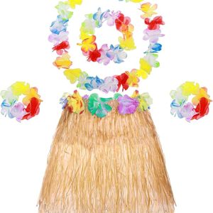 Yetişkin ve Çocuk Uyumlu Luau ha Hawaii Kolye Renkli Etek Taç ve Bileklik Seti