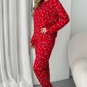 Kadın Pamuklu Yılbaşı Pijama Takım | Kırmızı Puantiye ve Candy Cane Desenli Pijama Takımı – Kırmızı